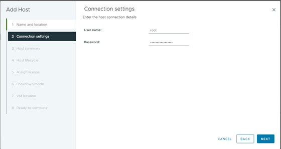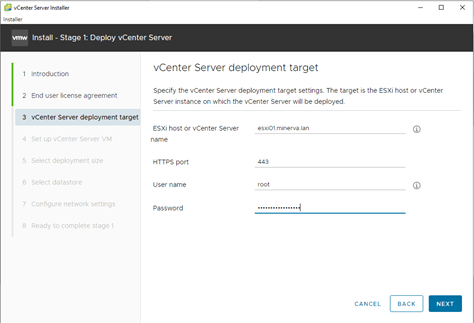 Since we will install this VCSA appliance in ESXi01, let’s enter the FQDN and root password for the host and hit ‘Next’.