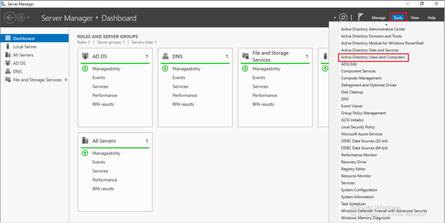 Click on ‘Tools’ and the ‘Active Directory Users and Computers’.