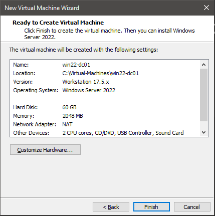Now, let’s create two more VMs by following the same process that we followed for this win22-dc01 VM. The only difference will be that these two will now be VMWare ESX VMs.