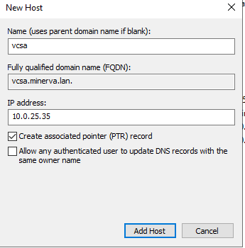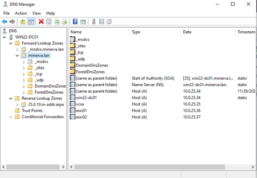 Let’s create some A-records the servers in our environment – VCSA, ESXi01, ESXi02, win22-dc01.