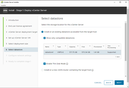 Select the needed datastore that contains enough free storage space. You can Enable Thin Disk Mode to use thin provisioned virtual disks for the VCSA VM to save storage space.